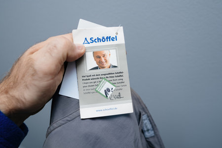 Bonn, Germany - May 5, 2024: Hand holding a Schoffel clothing tag featuring a portrait and multilingual message from Peter Schoffel against a grey background, showcasing brand details.