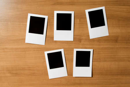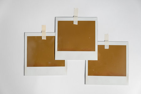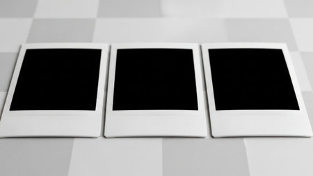 This image features three blank Polaroid photos arranged in a row on a tiled surface. The photos are white with black centers, indicating they are unused. The background consists of light and dark tiles, creating a checkered pattern.
