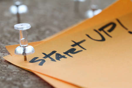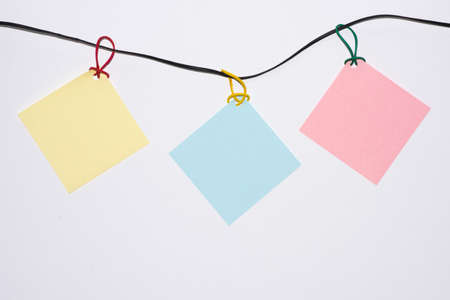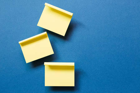 Business culture, office teamwork and work place communication concept theme with 4 (four) yellow sticky notes or adhesive memos isolated on blue background with copy space
