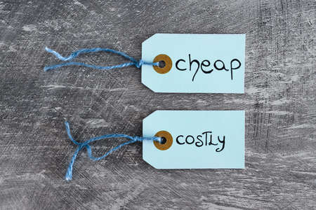 Cheap vs Costly prioduct price tags next to each other symbol of options for the customer, money and consumer behaviour conceptual image