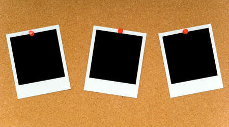 Old stained and faded postcard on a cork bulletin board with blank photo print