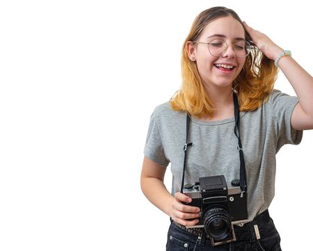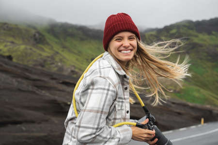 Woman with camera laughing out loud while taking photos in the mountains and hills
