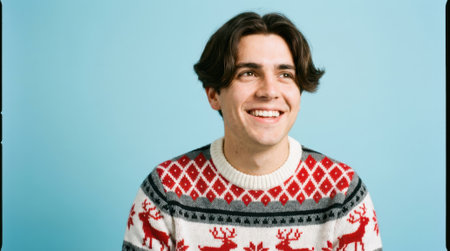 A cheerful young man with dark hair and a big smile, wearing a red and white Christmas sweater with reindeer and diamond patterns, against a light blue background.