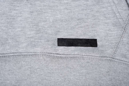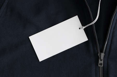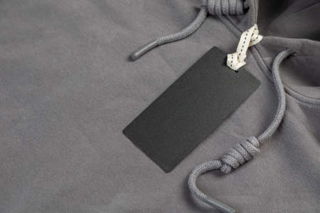 Blank Black Rectangular Clothing Tag, Label Mockup Template on Stylish Black Sportswear. Price Tag Label With Copy Space, Empty Space.