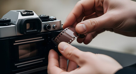 A close-up of a person's hands carefully loading a 35mm film strip into the back of a vintage analog SLR camera. The camera body is silver and black, representing traditional photography, a hobby, or nostalgia.