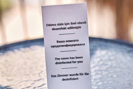 The room has been desinfected for you inscription in 4 languages: Russian, English, Turkish and German. Inscription in hotel. High quality photo