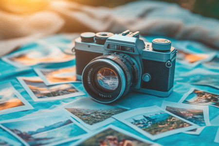 Vintage camera resting on a collection of printed travel photos, evoking memories of past journeys