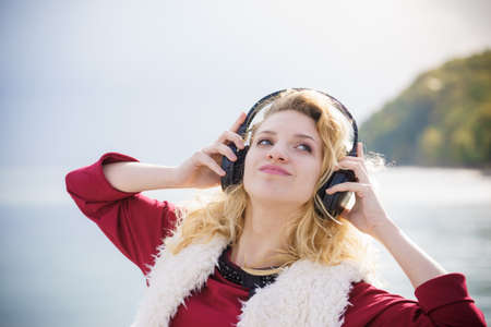 Happy joyful woman listening to music while being outdoor. Teenage female wearing headphones having fun on a walk.