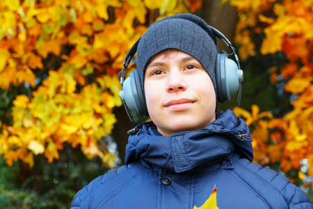 portrait of a teenager listening to music by headphones, relaxing in autumn city park, bright yellow maple leaves as background