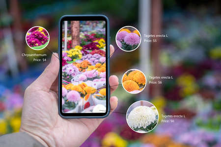 Augmented reality marketing . Hand holding smart phone use AR application to check information