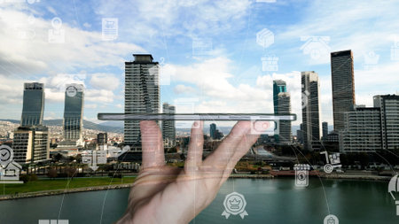 Augmented reality marketing street . Hand holding smart phone use AR application to check information