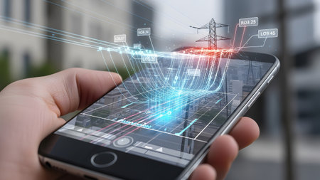Smartphone showing hand holding smartphone with augmented reality power line data flow.