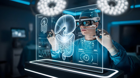Surgeon in VR headset performs advanced holographic surgery on a glowing human body. Clear detail...