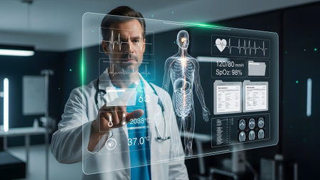 Doctor interacting with futuristic holographic display for advanced medical diagnostics