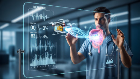 Physician analyzing real-time health data with a holographic drone and 3d organ model