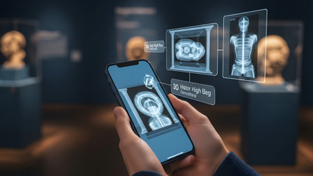Hands hold a smartphone showing AR X-ray views of ancient artifacts displayed in a museum.