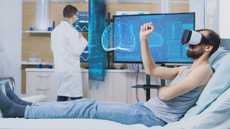 A doctor assists a patient with augmented reality technology in a contemporary hospital room during the day.