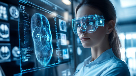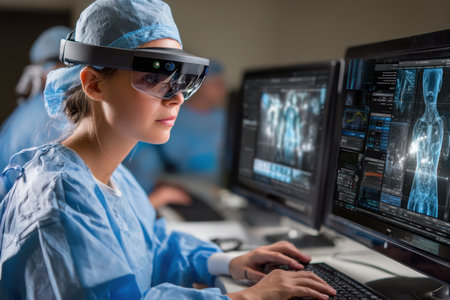 A medical professional in scrubs uses augmented reality glasses while analyzing patient data on multiple screens.