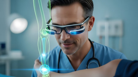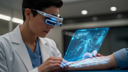 A doctor wearing AR glasses examines a holographic vein map projected onto a patient's arm.