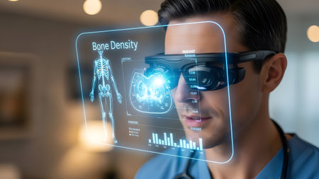 Doctor wearing AR glasses views a holographic display of a skeleton and bone density scan.