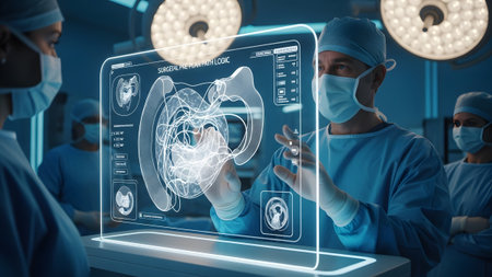 Medical staff collaborate on a futuristic interface to analyze patient data and improve care efficiency.