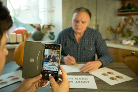 How to make Jack O'Lantern at home? Women's hands photograph the making of Jack O'Lantern at home. Selective focus and bokeh.