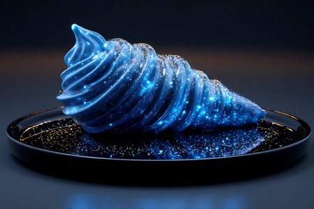 A luminous blue confection swirls elegantly its surface aglow with twinkling starlight on black plate.