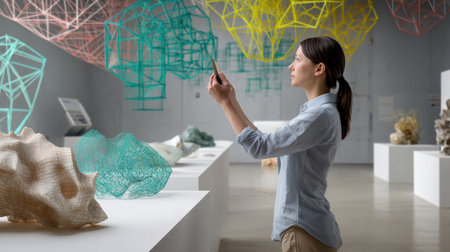 A designer manipulating a virtual sculpture in a 3D space with the environment showcasing digital tools and colorful wireframe models hovering around them