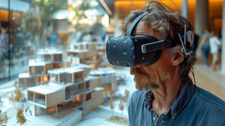 Senior man wearing virtual reality goggles in a shopping mall. Technology and entertainment concept.