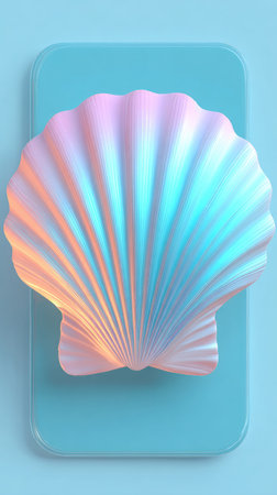 A beautiful seashell with iridescent colors, resting on a blue surface, perfect for design.