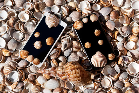 Two smart phones lying among natural seashells