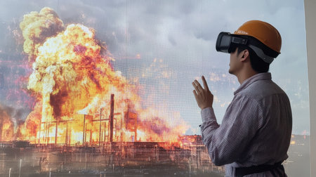 A male user wearing a hard hat engages with a virtual reality headset, interacting with a vivid industrial fire simulation, enhancing safety training and awareness.