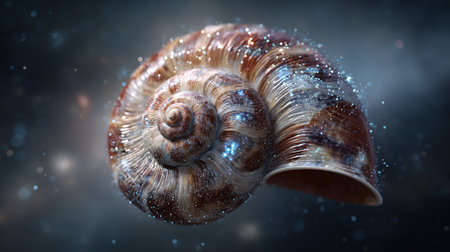 Close-up of a seashell with water droplets and bokeh effect, showing the intricate patterns and natural beauty of marine life.