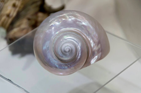 A detailed image presents a nautilus shell against a neutral backdrop. The shell showcases a pearlescent white exterior and brown interior patterns. The composition uses balanced lighting, emphasizing form and texture. It is suitable for various design projects and commercial applications.