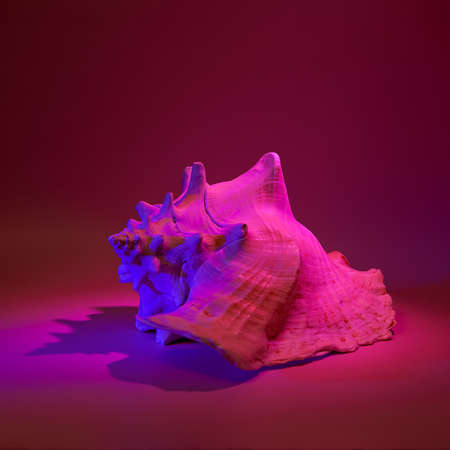 Chicoreus ramosus shell on a dark background with neon lights. Stock photo Chicoreus ramosus.