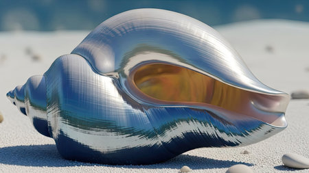 A close-up captures a polished silver seashell resting on a light-colored sandy surface. The shell reflects the surrounding environment, showcasing shades of blue and gold. The composition highlights the shell's texture and form, with sunlight adding depth. Suitable for various creative projects and editorial uses.