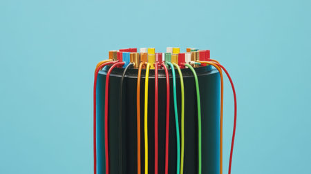 A visually striking image of colorful electrical wires connected to a black cylindrical object set against a soothing light blue background, emphasizing technology and design.