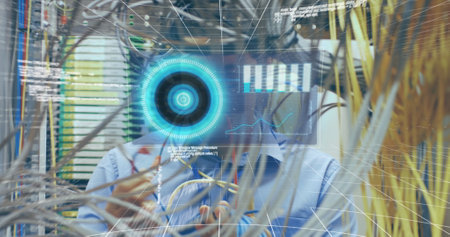 Image of data processing over caucasian male it engineer fixing cables of computer server. global connections, data processing and computing concept digitally generated image.