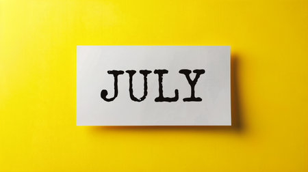 JULY word on wooden cube on black gloss wooden table. Selected focus