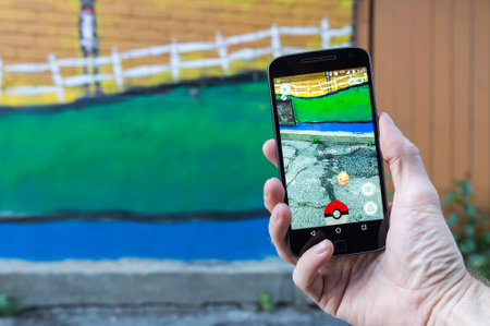 Montreal, CA - July 27, 2016: Closeup of a man playing Pokemon Go on a smart phone. Pokemon Go is a virtual reality game released in July 2016.