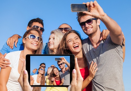 Closely image of female hands holding mobile phone with photo camera mode on the screen. Group of happy friends drinking cocktails at summer bar