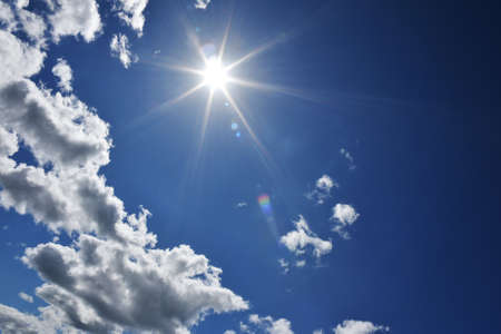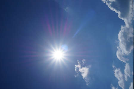 blue sky with clouds and sun reflection.The sun shines bright in the daytime in summer
