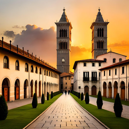 Sunset over a serene garden pathway leading to a classic villa