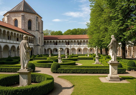 A serene historic courtyard featuring well-maintained lawns, a large tree, and classical architecture in Rajhrad, Czech Republic. The scene evokes feelings of tranquility and timeless beauty, perfect for a heritage setting.