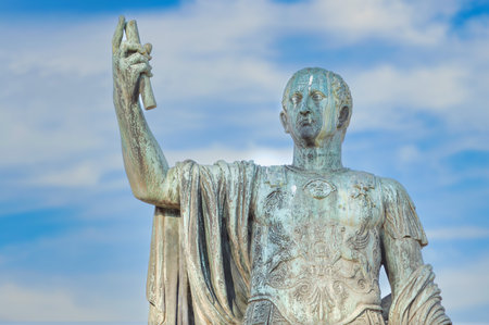 Detail of the bronze statue of the Roman emperor Julius Caesar in Via Dei Fori Imperiali in the center of Rome.