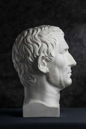 Gypsum copy of ancient statue Augustus head on dark textured background. Plaster sculpture man face.