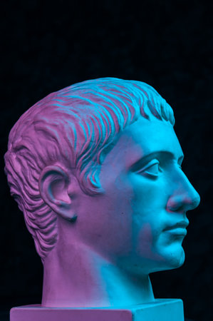 Statue of Guy Julius Caesar Octavian Augustus. Creative concept colorful neon image with ancient roman sculpture Guy Julius Caesar Octavian Augustus head. Cyberpunk, vaporwave and surreal art style.