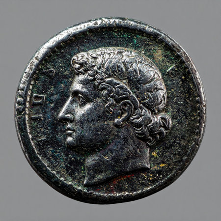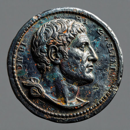 A detailed macro shot of an ancient Roman silver coin, showcasing the profile of a powerful emperor.