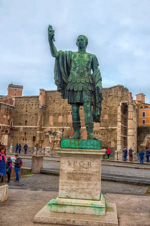 Detail of the bronze statue of the Roman emperor Julius Caesar in Via Dei Fori Imperiali in the center of Rome.