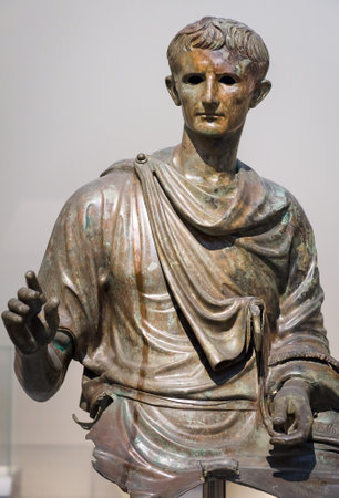 Athens - May 7, 2018: Antique statue of emperor Augustus in the National Archaeological Museum in Athens, Greece. Classic bronze sculpture. Caesar Augustus is the famous Ancient Roman ruler.